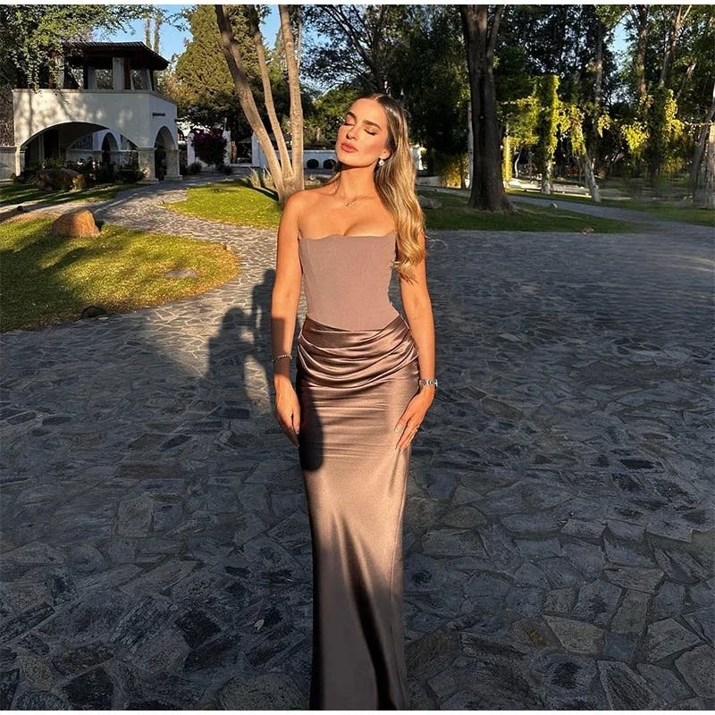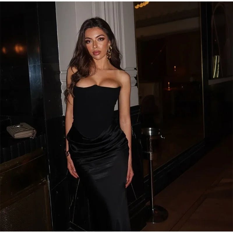 Luxe Strapless Satin Corset Gown – Ruched Maxi Dress